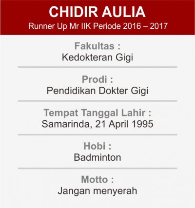 Perasaan saya ketika dinobatkan menjadi Runner up Mr IIK sangat bangga, terutama bangga terhadap diri saya sendiri. Saya bersyukur kepada Allah SWT atas nikmat yang diberikan Allah kepada saya. Saya juga mengucapkan terimakasih untuk kedua orang tua saya atas support dan semangat yang diberikan kepada saya selama ini. Tak lupa, terimakasih saya ucapkan untuk semua lapisan masyarakat yang telah mendukung saya.