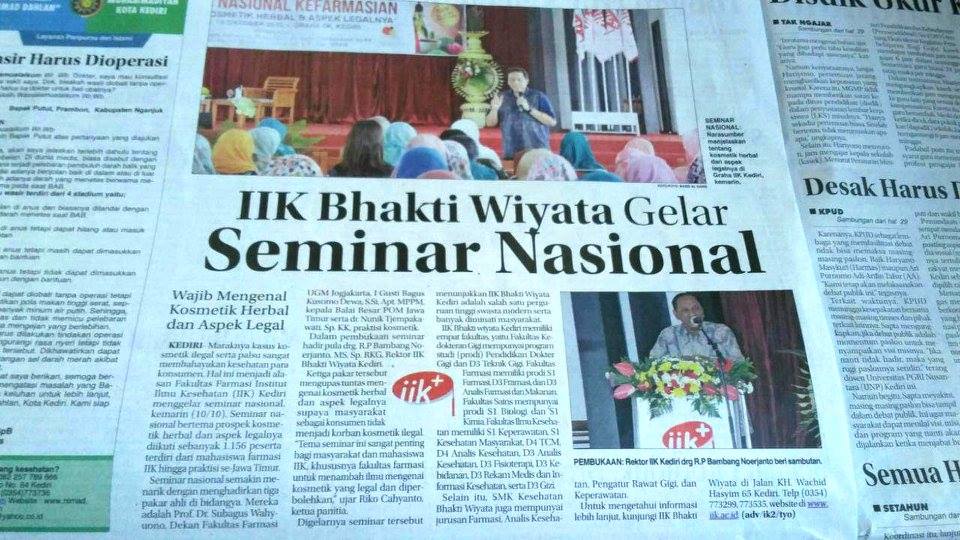 Pada tanggal 10 Oktober 2015 IIK Bhakti Wiyata Kediri mengadakan seminar nasional kefarmasian dengan tema "Prospek Kosmetik Herbal & Aspek Legalnya" bertempat di Graha IIK lantai 4.