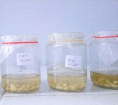 Buah kedelai yang tumbuh lebat setelah diberi ekstrak etanolik.  Biji kedelai yang direndam menggunakan ekstrak etanolik daun tapak dara.  Bunga kecambah yang mulai tumbuh.