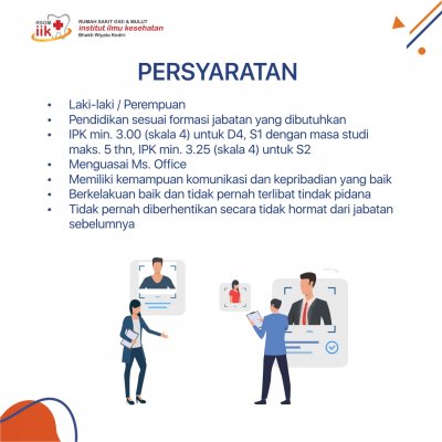 Institut Ilmu Kesehatan Bhakti Wiyata merupakan universitas yang mencetak tenaga kesehatan berkompetensi dan profesional. Untuk terus mengembangkan kualitas pelayanan pendidikan, kami membutuhkan tenaga profesional yang handal dan berkompetensi untuk mengisi posisi sebagai: Kualifikasi: Laki-Laki/Perempuan Usia Maksimal 35 tahun Memiliki STR Aktif - Perawat Gigi/Terapis Gigi