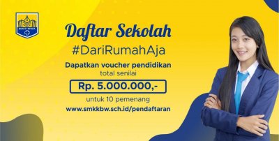Kegiatan dari rumah aja kini lebih disarankan untuk dilakukan sejak adanya pendemi COVID-19. Oleh karena itu, SMK Kesehatan Bhakti Wiyata turut menggalakkan aksi #dirumahaja dengan cara mengapresiasi para pendaftar online di SMK Kesehatan Bhakti Wiyata untuk berpeluang memenangkan voucher pendidikan total senilai 5 Juta Rupiah. Voucher pendidikan ini nantinya akan dibagikan untuk 10 orang pemenang yang telah memenuhi persyaratan. Adapun syarat dan ketentuannya adalah sebagai berikut: - Daftar secara online di www.smkkbw.sch.id/pendaftaran selama program berlangsung (12 Juni – 15 Juli 2020).