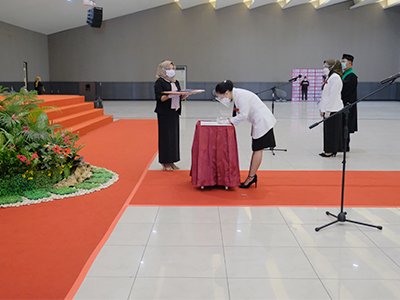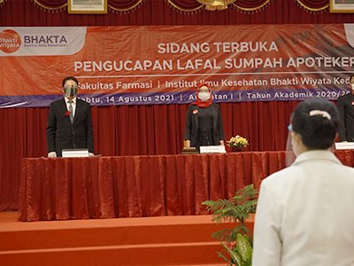 Fakultas Farmasi Institut Ilmu Kesehatan Bhakti Wiyata Kediri sukses melaksanakan sidang pengucapan lafal sumpah apoteker pada Sabtu (14/8/2021). Diresmikan pada 17 Oktober 2019, program studi profesi apoteker adalah program studi (Prodi) termuda di lingkungan Institut Ilmu Kesehatan Bhakti Wiyata. Dibawah pimpinan apt. Yogi Bhakti Marhenta.,M.Farm selaku kepala program studi, Prodi termuda tersebut berhasil menjawab tantangan dengan meluluskan 35 apoteker Angkatan pertama. “Suatu capaian luar biasa, tangis haru bahagia dan kebanggan untuk kami, bisa mengantarkan mahasiswa kami menjadi apoteker pertama dari Fakultas Farmasi IIK Bhakta” ucap beliau ketika di wawancara. Ia juga menjelaskan bahwa sebagian besar dari 35 orang ini sudah dipinang oleh berbagai instansi mulai dari industri farmasi hingga rumah sakit. “Artinya mereka sudah mendapatkan pekerjaan bahkan sebelum lulus.” Pungkasnya. Ketua Ikatan Apoteker Indonesia (IAI) turut mengucapkan selamat kepada seluruh dosen dan orangtua atas capaiannya dalam mengantarkan putra putri mereka menjadi apoteker. “Atas nama pengurus pusat IAI, anda sekalian kami panggil dengan sebutan rekan sejawat. Saya punya sejarah panjang dengan IIK Bhakta kediri dalam proses pendirian program studi profesi apoteker sampai dengan hari ini adik adik apoteker diambil sumpahnya. Jadi saya ikut senang, ikut bangga, selamat kepada orang tua telah mengantarkan putra putrinya menjadi apoteker.” Ia berpesan kepada apoteker baru agar berpraktek dengan amanat, taat aturan, dan memegang erat etika profesi apoteker agar profesi kita bisa terlihat perannya secara nyata di Indonesia. Sejalan dengan capaian tersebut, apresiasi juga diberikan oleh Apt Drs Nurul Falah Eddy Pariang selaku ketua Ikatan Apoteker Indonesia. “Tingkat kelulusan 87,5% untuk Angkatan pertama ini jempolan sekali, prestasi yang luar biasa, ini bukti bahwa IIK Bhakta luar biasa didalam effortnya”. Seperti diketahui Bersama, bahwa untuk menjadi apoteker salah satunya harus lulus dalam Ujian Kompetensi Apoteker Indonesia (UKAI). Tampil dengan predikat lulusan terbaik, disandang oleh apt.Amalia Ralita Lanuru,.S.Farm asal Kota Merauke, Papua. Amalia menjadi lulusan terbaik setelah berhasil lulus dengan IPK 3,9 dan juga mencatatkan nilai rata rata tertinggi dalam UKAI di tingkat nasional.