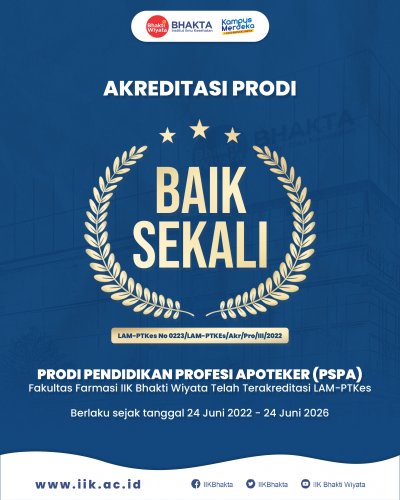 Kabar menggembirakan datang dari Program Studi (Prodi) Pendidikan Profesi Apoteker (PSPA) IIK Bhakti Wiyata (IIK Bhakta). Pasalnya walaupun terhitung prodi usia muda (2,5 tahun), PSPA IIK Bhakta mampu menunjukkan peningkatan status akreditasi yang sangat pesat. Kabar itu resmi diterima melalui Surat Keputusan Pengurus Perkumpulan LAM-PTKes, Selasa (05/04/2022). Dalam surat keputusan bernomor SK 0223/LAM-PTKEs/Akr/Pro/III/2022 yang ditandatangani oleh Prof.Dr.Usman Chatib Warsa, Sp. Mk., Phd. tersebut menetapkan bahwa status, nilai dan peringkat akreditasi PSPA IIK Bhakta adalah “BAIK SEKALI” berlaku sejak tanggal 24 Juni 2022 sampai dengan 24 Juni 2026. Sebagaimana diketahui, berdasarkan Peraturan BAN-PT Nomor 1 Tahun 2020, Akreditasi Perguruan Tinggi tidak lagi menggunakan model A, B, dan C. Dalam peraturan tersebut BAN PT telah mengeluarkan Regulasi IAPS 4.0 dan IAPT 3.0 yang merupakan instrumen terbaru untuk melihat kualifikasi perguruan tinggi dan kualitas program studi pada Perguruan Tinggi Negeri dan Perguruan Tinggi Swasta. Satu perubahan pada Peraturan BAN-PT Nomor 1 Tahun 2020 adalah istilah peringkat akreditasi atau peringkat terakreditasi menjadi Unggul, Baik Sekali dan Baik atau Tidak Terakreditasi.