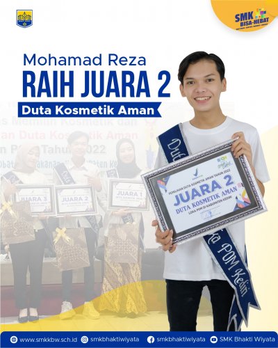 Siswa SMKK Bhakta kembali mencetak prestasi, prestasi kali ini berhasil diraih oleh Mohamad Reza Aditya dari kelas XI-B Keperawatan. Pada tanggal 30-31 Mei 2022 lalu, Reza telah selesai mengikuti lomba "Duta Kosmetik Aman" yang diselenggarakan oleh BPOM di Kabupaten Kediri, dan berhasil meraih juara kedua. Tujuan diselenggarakan kegiatan lomba ini adalah bentuk ajakan kepada para pelajar dan mahasiswa sebagai generasi muda untuk menjadi spokeperson kosmetik yang aman di masyarakat melalui kegiatan “Pemilihan Duta Kosmetik Aman dalam rangka Program Badan POM Goes to School/Campus”. Diharapkan para duta terpilih mampu membatu memberikan edukasi kepada masyarakat tentang pemilihan dan penggunaan kosmetik yang aman. Sekali lagi selamat kepada Reza dan seluruh para pemenang.