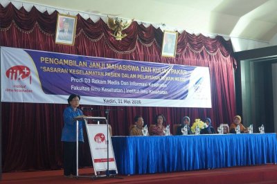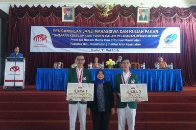 IIK Kediri, 31 Mei 2016- Suasana khidmat mewarnai kegiatan Pengambilan Janji Mahasiswa D3 RMIK IIK Pra PKL yang berlangsung hari ini di lantai 4 Graha IIK. Acara diawali dengan Dance Hand Higiene oleh perwakilan mahasiswa D3 RMIK. Dilanjutkan prosesi penyerahan medali dan sertifikat juara kepada dua mahasiswa yang memenangkan perlombaan skala nasional di UGM 27 Mei 2016 lalu (Baca juga: IIK Kampus Pencetak Generasi Berprestasi). Pembacaan janji mahasiswa dilakukan oleh Dekan FIK, yakni dr. Hartati Tuna, M.Kes. dan diikuti oleh seluruh mahasiswa D3 RMIK yang akan melaksanakan PKL. Tak berhenti sampai disitu, acara pun dilanjutkan dengan kuliah pakar D3 RMIK IIK dengan tema “Sasaran Keselamatan Pasien Dalam Pelayanan Rekam Medis”. Pemateri disampaikan oleh Ibu Anna Rosarini A.Md PK, SH dan Ibu Putri Kristyaningsih, M.Kep., Ns. Tujuan diadakannya kuliah pakar ini ialah agar para mahasiswa D3 RMIK dapat menambah dan memperdalam ilmunya serta mengabdi di tengah masyarakat dengan baik dan profesional. IIK Developing Health Experts!