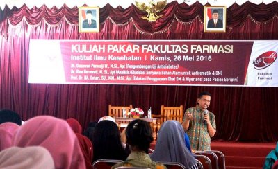 Kamis, 26 Mei 2016 lalu Fakultas Farmasi Institut Ilmu Kesehatan telah berhasil mengadakan “Kuliah Pakar” yang diadakan untuk kalangan mahasiswa Farmasi IIK. Acara yang dimulai dari pukul 08.00 di Lantai 4 Graha IIK tersebut berjalan dengan lancar dan para peserta tampak antusias mengikuti 3 materi yang dipaparkan oleh para nasumber. Adapun nama-nama dari narasumber serta materi yang disampaikan antara lain: 1. Dr. Gunawan Pamudji W., M.Si., Apt. (Pengembangan Uji Antidiabetes) 2. Dr. Rina Herowati, M.Si., Apt. (Analisis/Elusidasi Senyawa Bahan Alam untuk Antirematik & DM) 3. Prof. Dr. RA. Oetari, SU., MM., M.Si., Apt (Edukasi Penggunaan Obat DM & Hipertensi pada Pasien Geriatri) Acara yang digelar selama sehari tersebut berakhir dengan sesi tanya jawab antara peserta dengan narasumber. Semoga dengan adanya acara ini, mahasiswa fakultas Farmasi IIK dapat menambah pengetahuan terhadap disiplin ilmunya yang kelak dapat berguna di masa depan mereka. Ke depannya, IIK akan terus berupaya mengadakan acara seperti ini untuk fakultas lainnya yang ada di IIK karena misi IIK adalah mencetak tenaga kesehatan yang handal dan profesional. IIK Developing Health Experts! Baca juga: Pengambilan janji pra PKL dan Kuliah pakar D3 RMIK